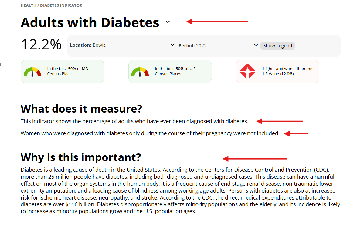 The Indicator Detail Page is designed to give you more information about a specific indicator. Text on the Indicator Detail Page provides context about the indicator topic.