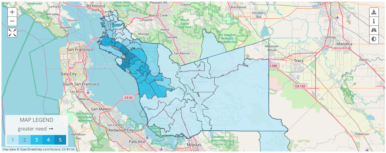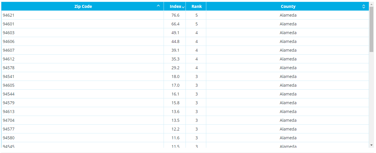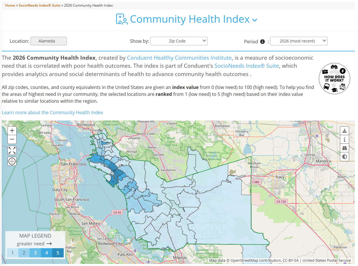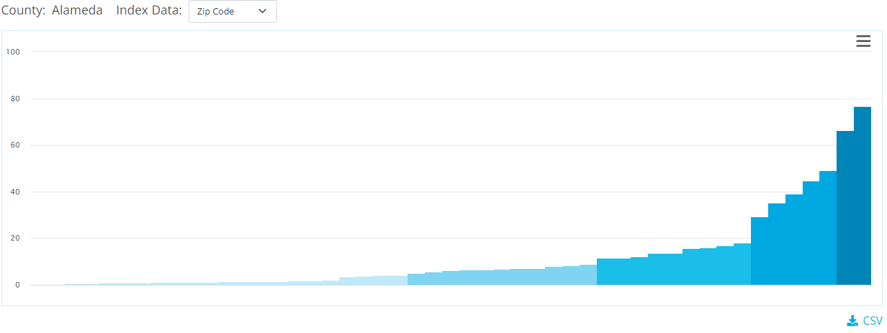 The national index value (from 0 to 100) is calculated for each zip code, census tract, and county in the United States. Communities with the highest index values are estimated to have the highest socioeconomic needs correlated with poor health outcomes.