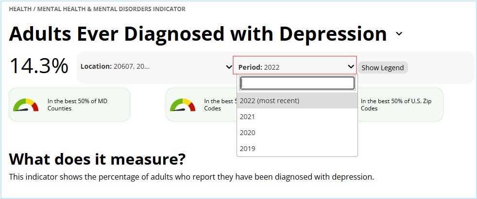 It's easy to select and view data from past time periods on your site. From the Indicator Detail Page, select a time period under the indicator name. This will update and change all the data and comparisons on the page.